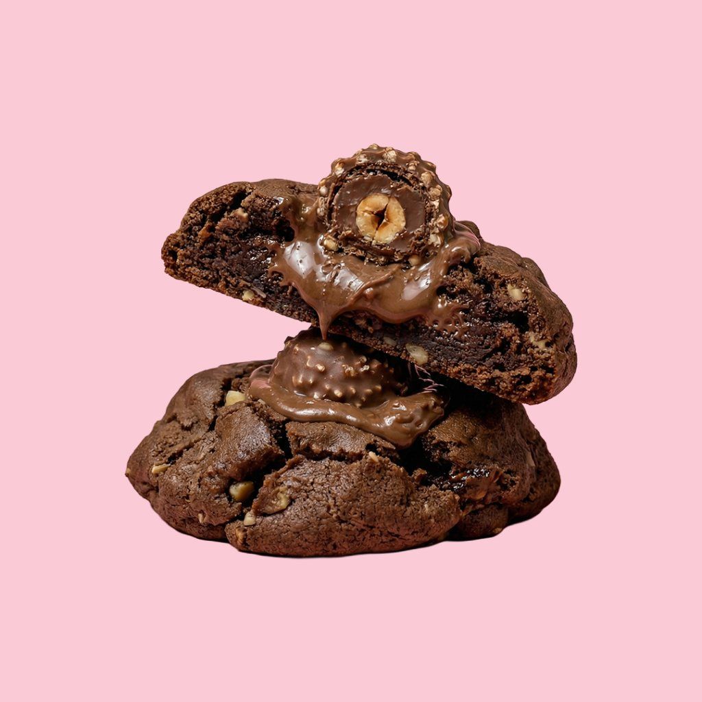 Šťavnatá Rocherka cookie – čokoládové těsto plné kuliček Rocher, uvnitř krémová Nutella a navíc extra lískové ořechy pro pořádný křup.